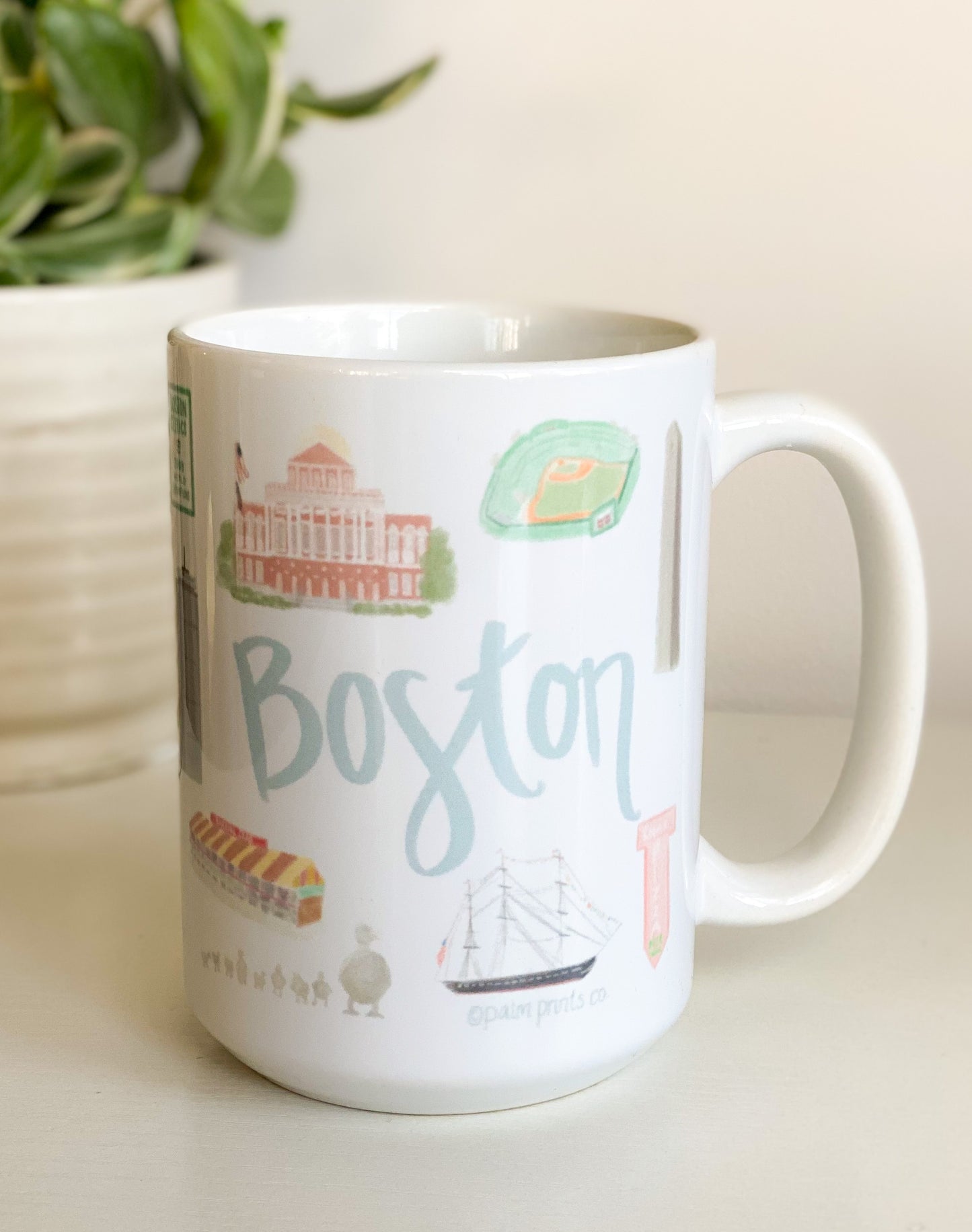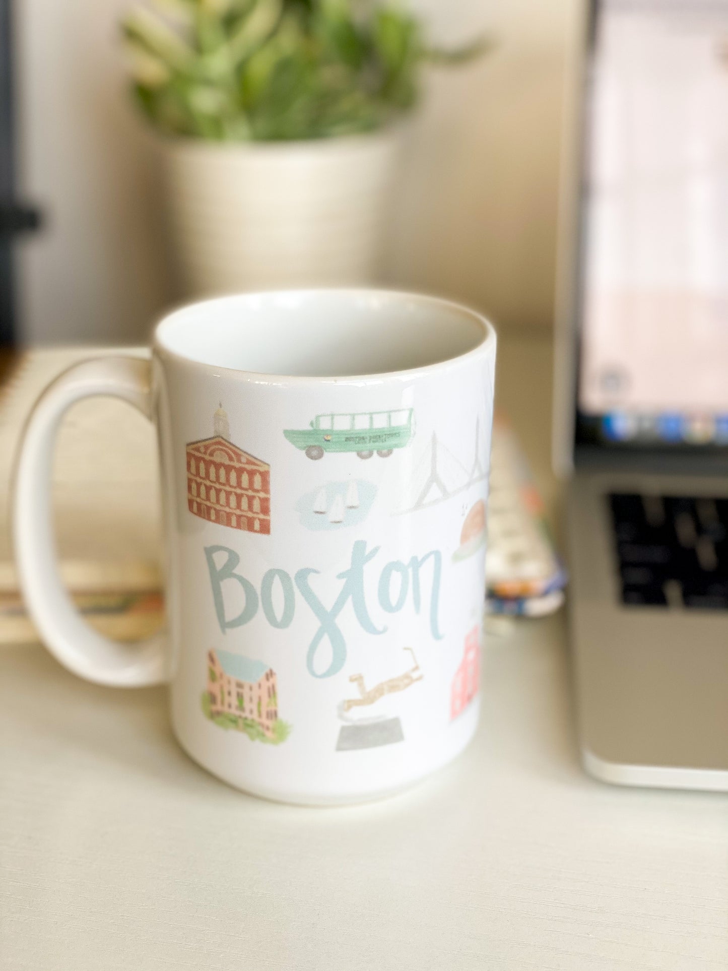 Think about your favorite city while sipping your coffee out of this beautiful ceramic mug. Features hand drawn images of popular Boston landmarks wrapped around the mug: the Isabella Stewart Gardner museum, The Duckboats, the Bobby Orr statue, Zakim Bridge, the Hatch Memorial Shell, Old North Church, Prudential Tower, Barking Crab, State House, USS Constitution, Fenway Park, Bunker Hill Monument, Make Way for Ducklings, and more!