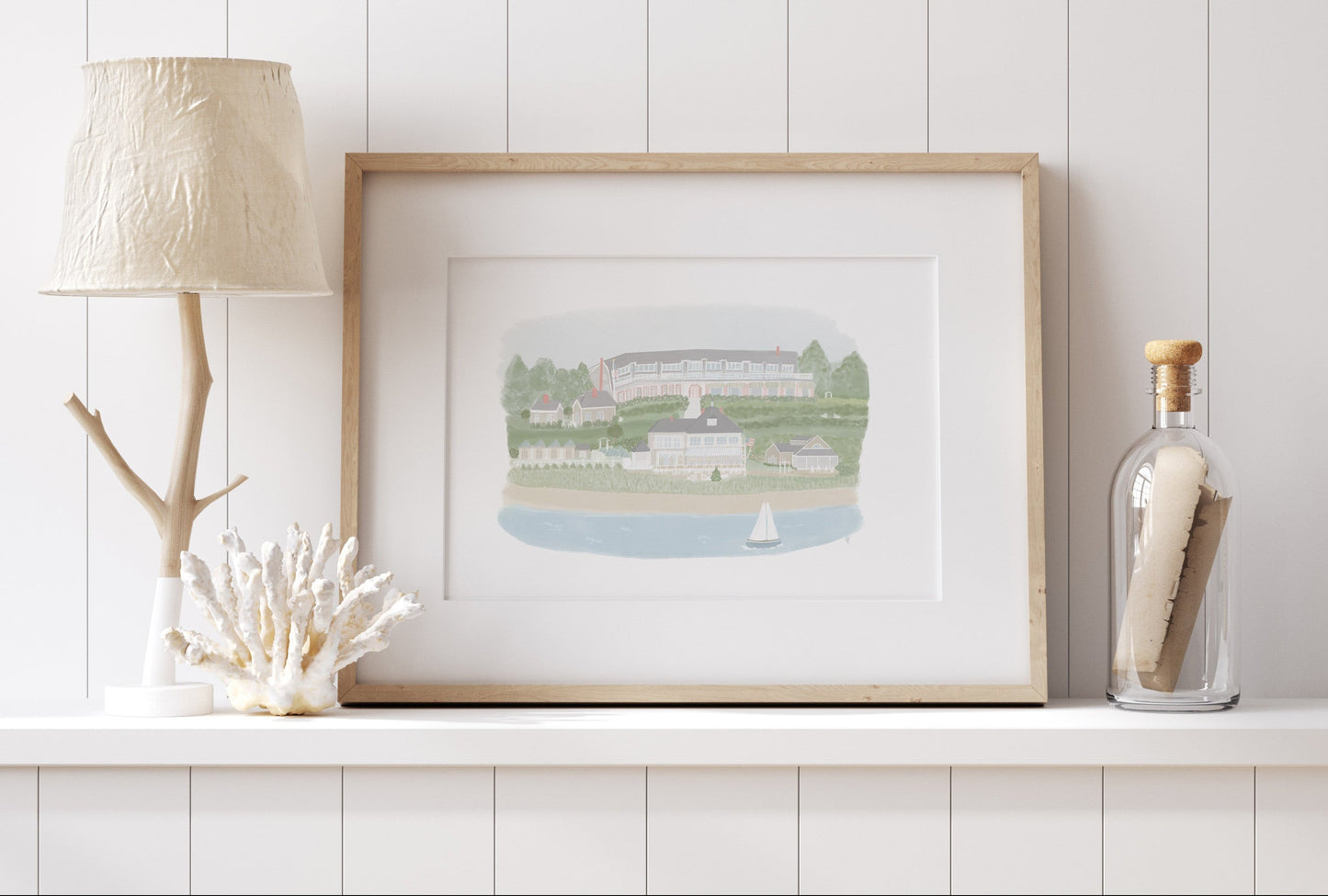 Framed artwork on a shelf with decorative items against a white paneled wall
