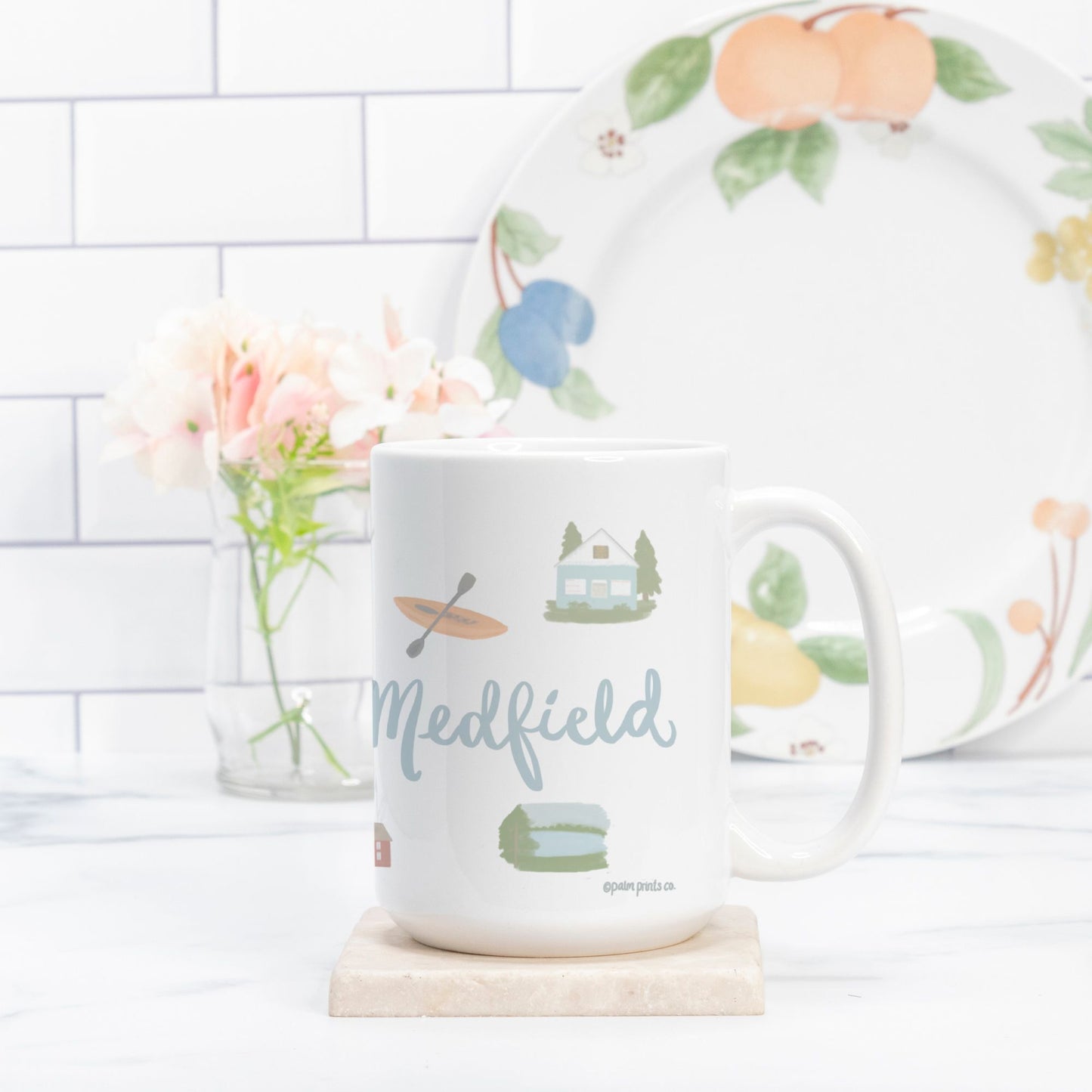 Think about your favorite Massachusetts town while sipping your coffee out of this beautiful ceramic mug. Features hand drawn images of icons representing Medfield, Massachusetts that wrap around the mug.