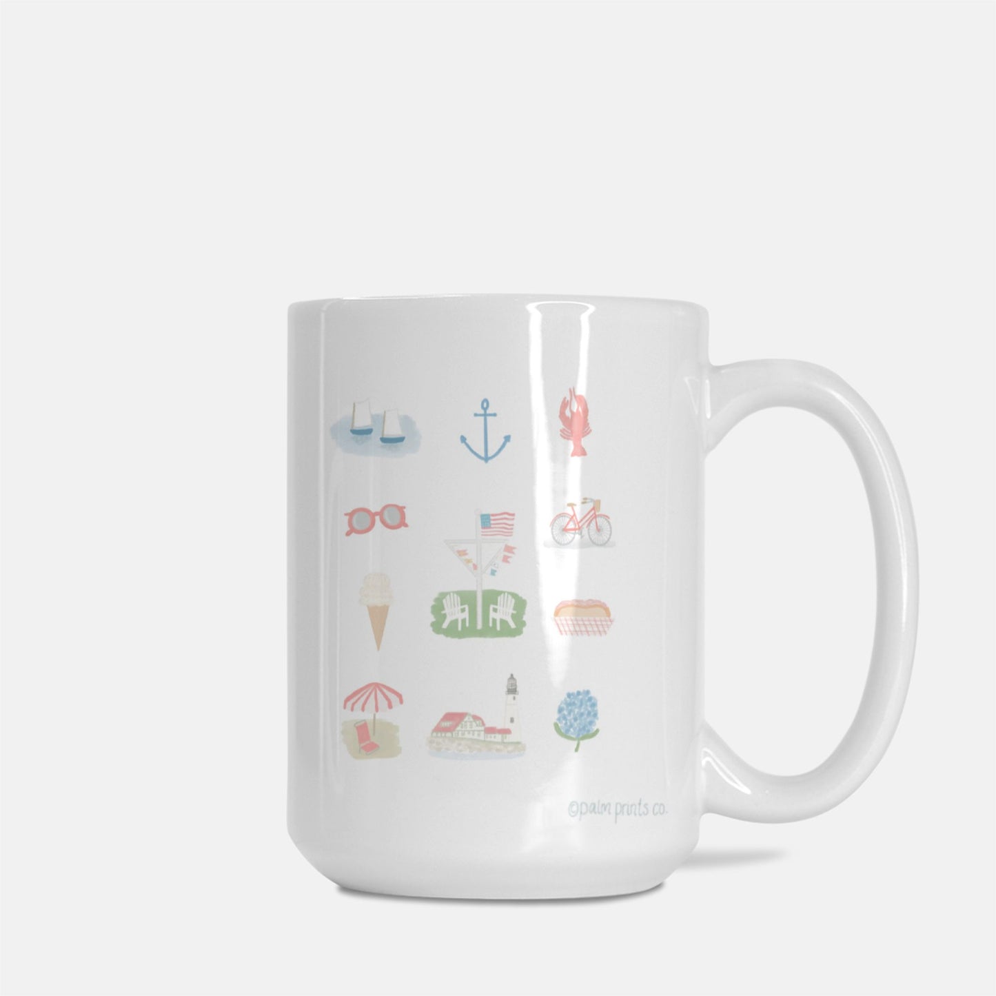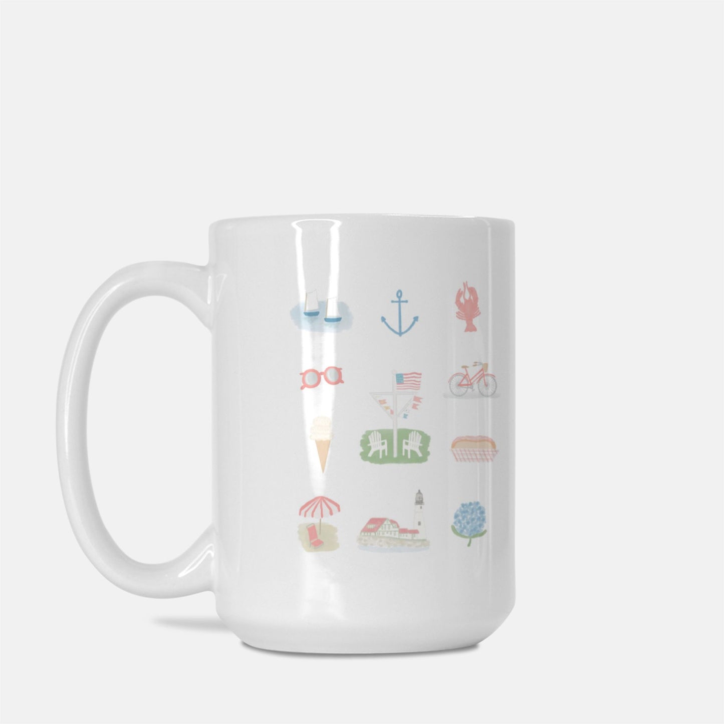 Think about summertime in New England while sipping your coffee out of this beautiful ceramic mug. Features hand drawn images of icons that represent New England summer wrapped all the way around the mug.