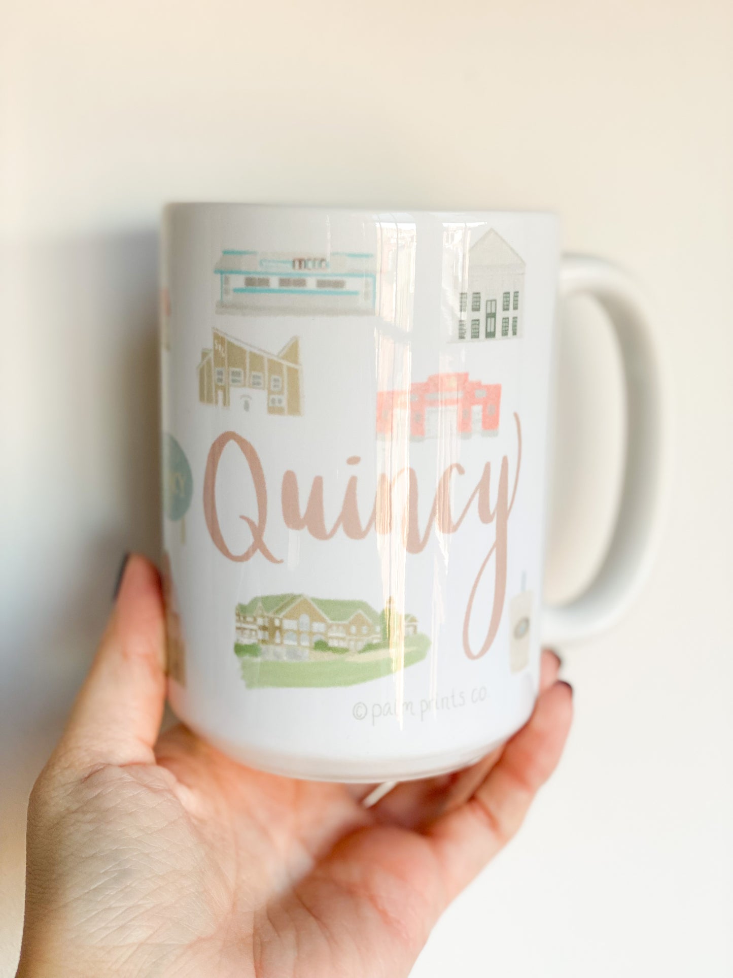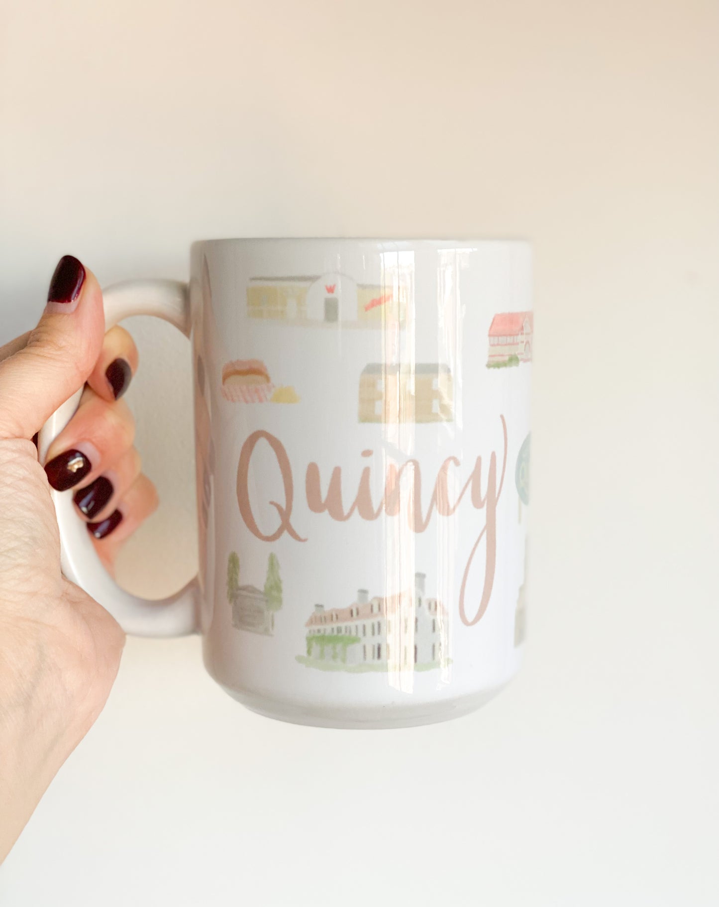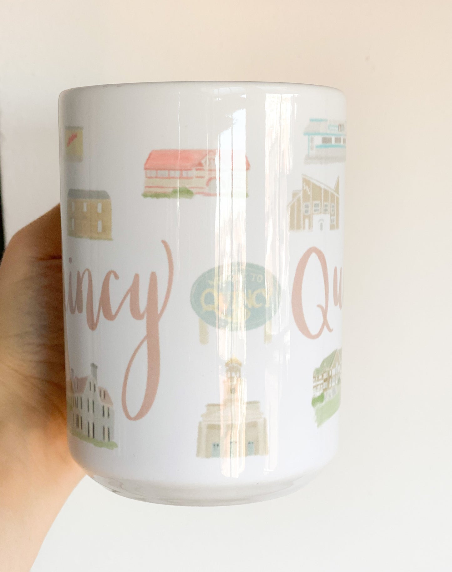 Think about your favorite city while sipping your coffee out of this beautiful ceramic mug. Features hand drawn images of popular Quincy landmarks wrapped around the mug.
