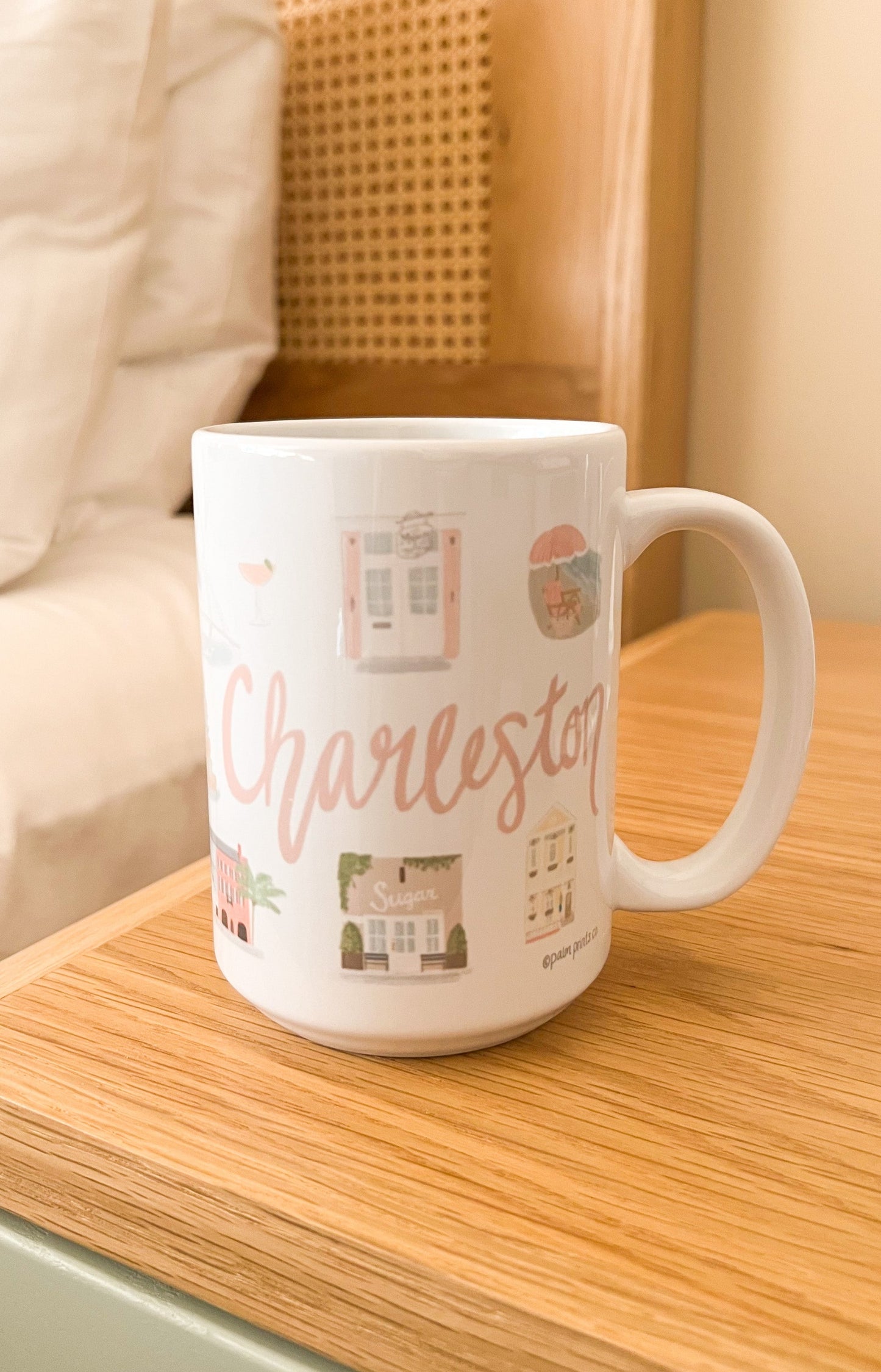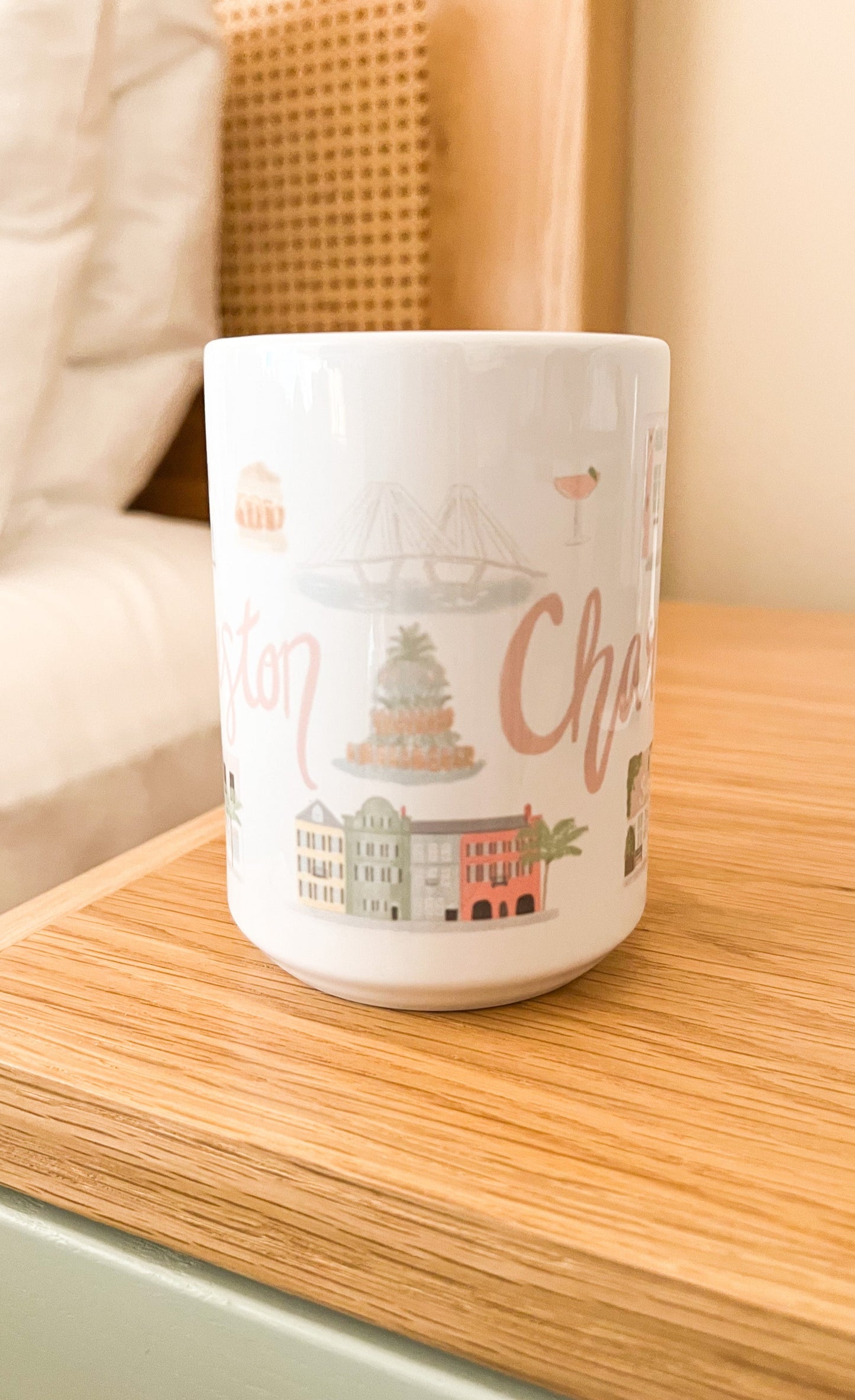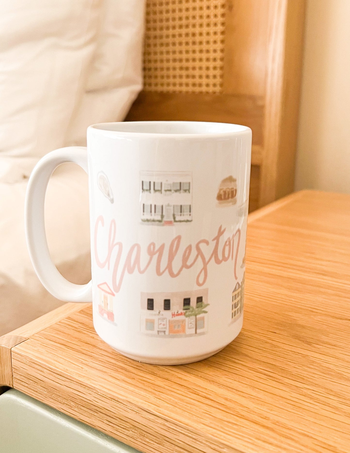 Daydream about your favorite memories in beautiful Charleston, South Carolina while sipping your coffee out of this beautiful ceramic mug. Features hand drawn images of icons wrapped all of the way around the mug that will remind you of this colorful coastal city.